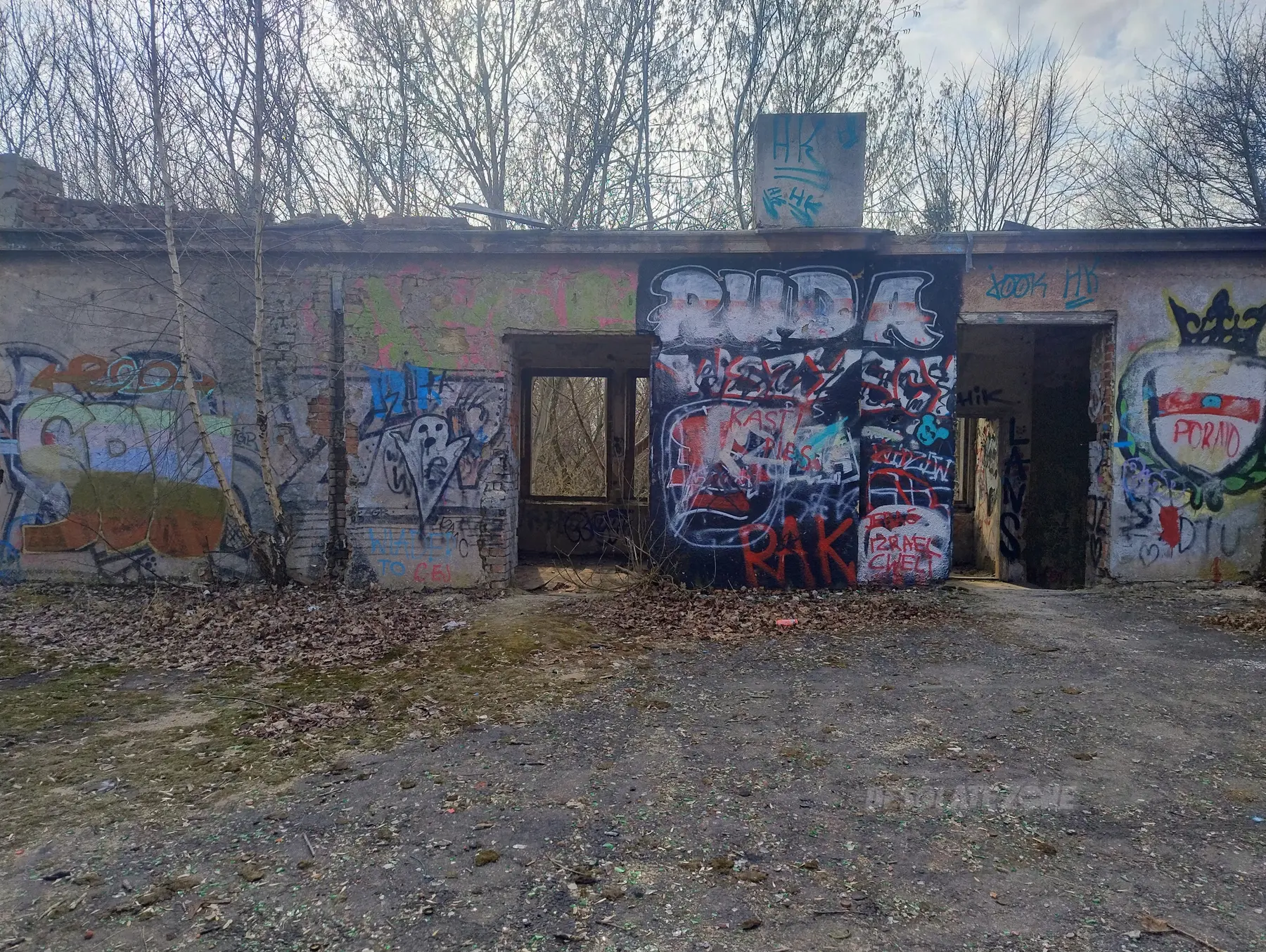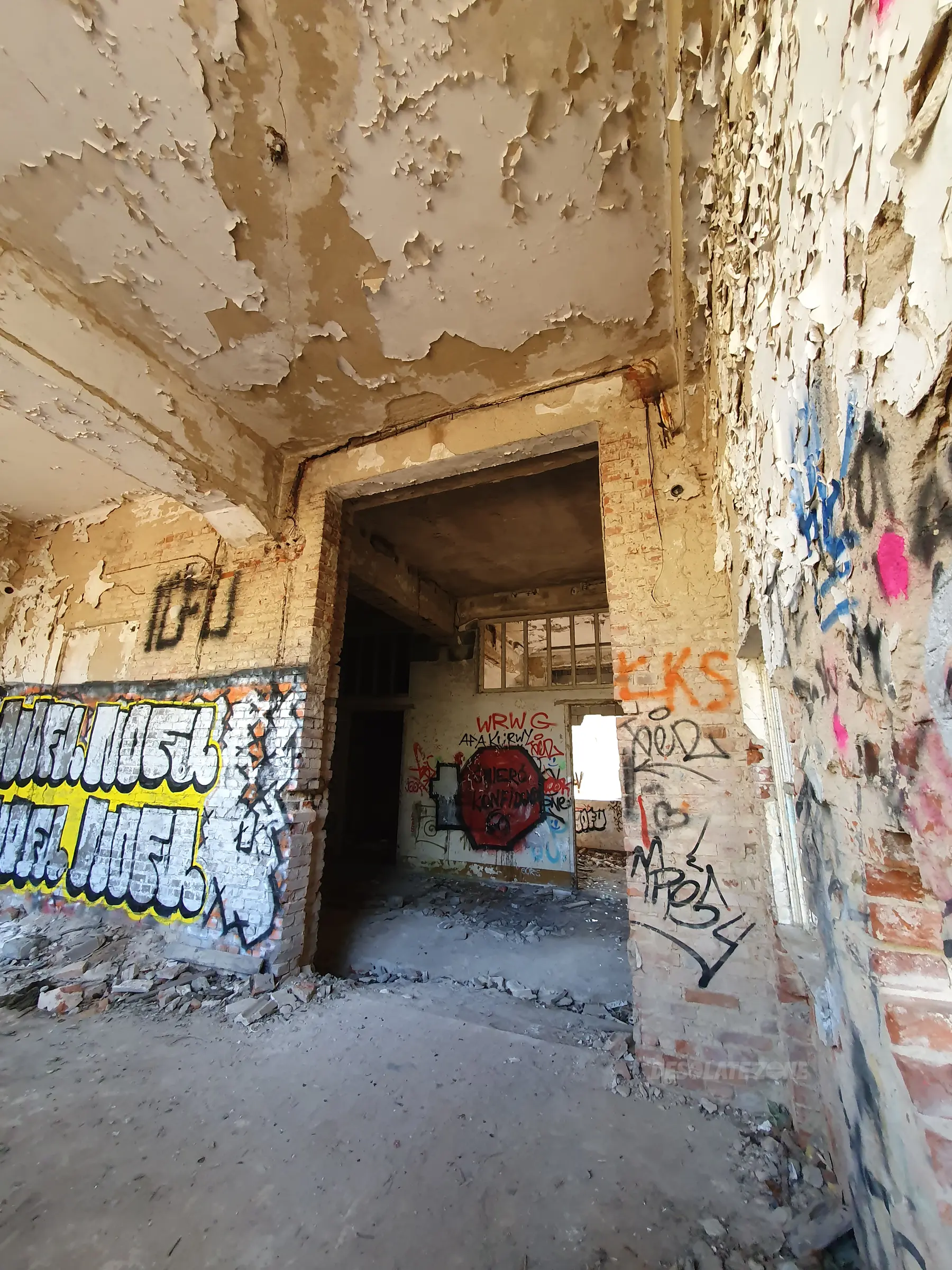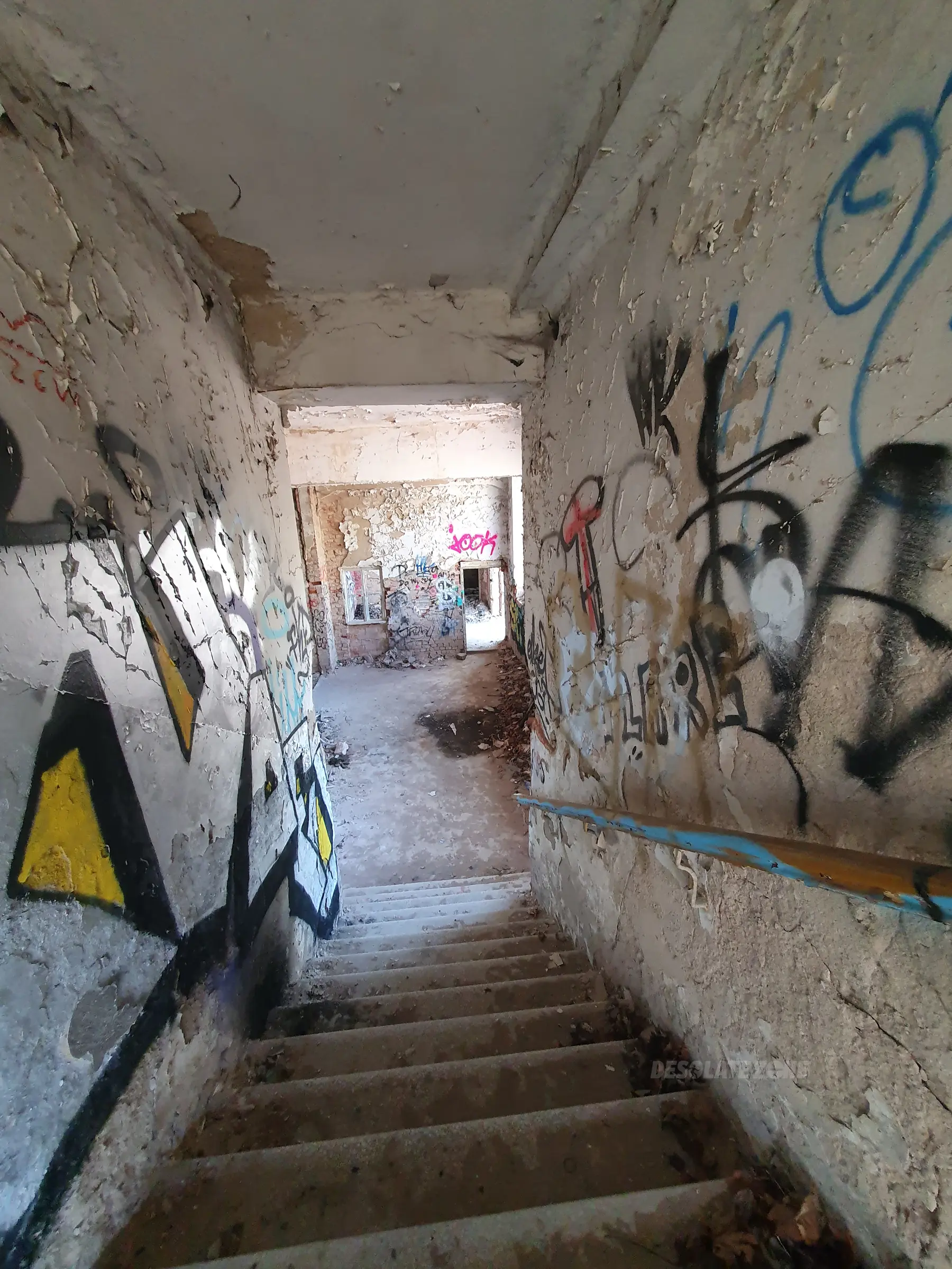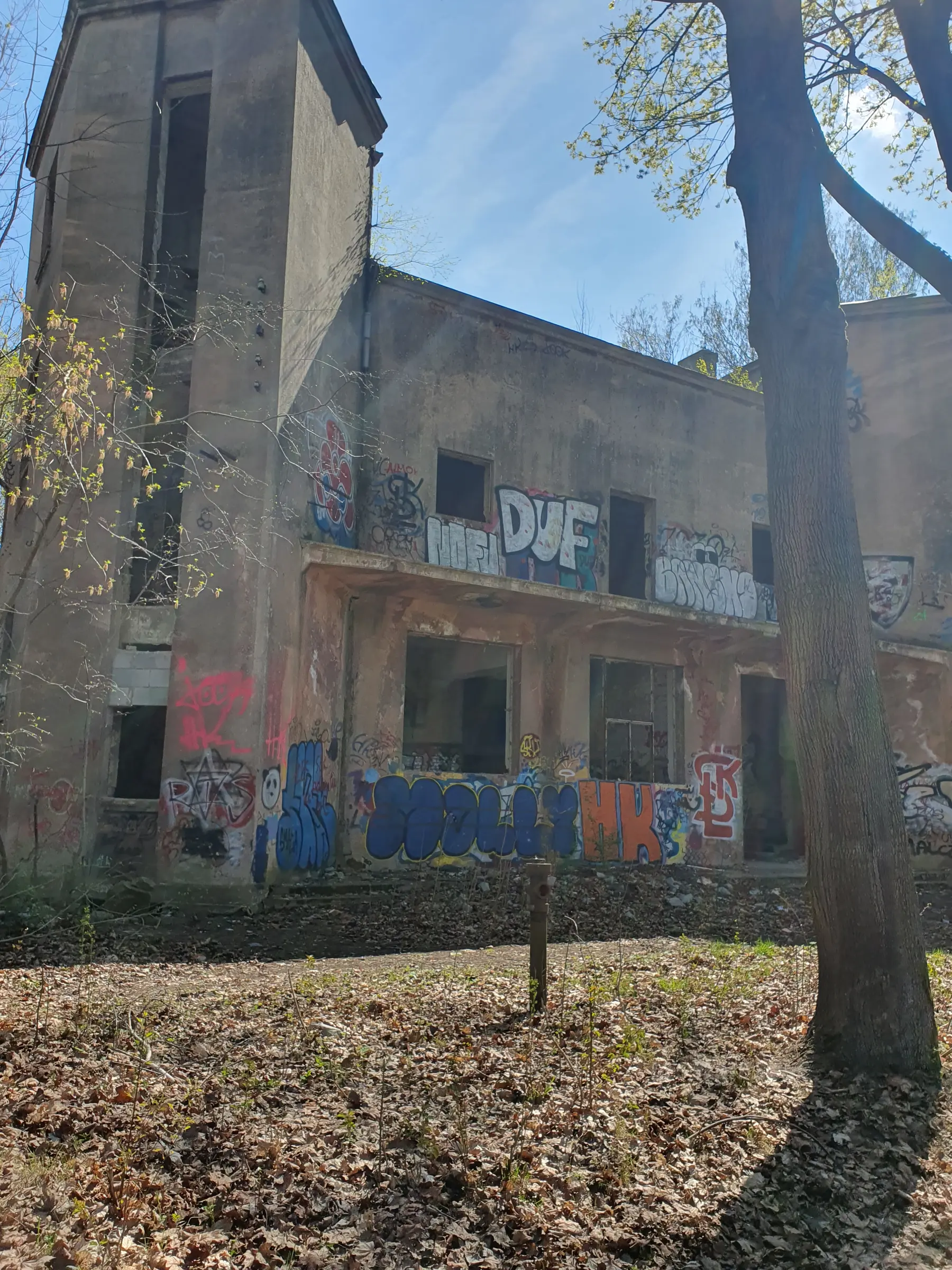 Kilka mniejszych budynków i jeden duży. Nic ciekawego poniszczone piętra zamurowane okna chociaż drzwi robią wrażenie. Można wejść na dach ale widoków nie ma. Teren bardzo duży i trochę chodzenia jest. Z daleka nie radzę. Załączam kilka fotek.