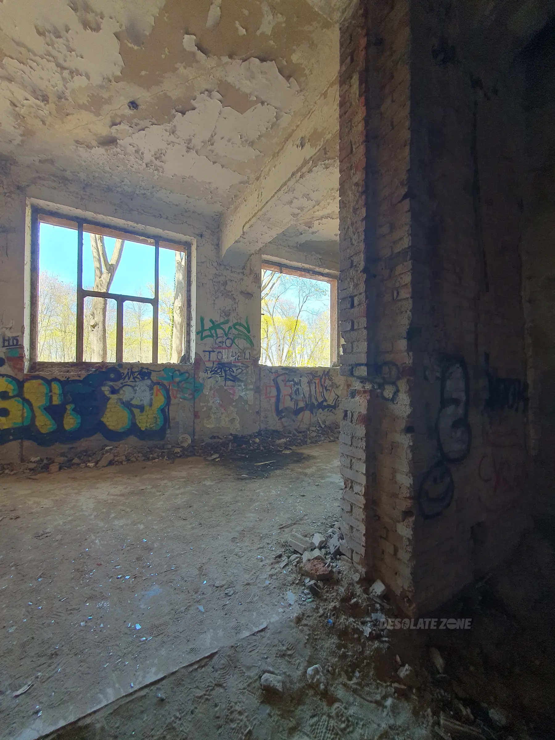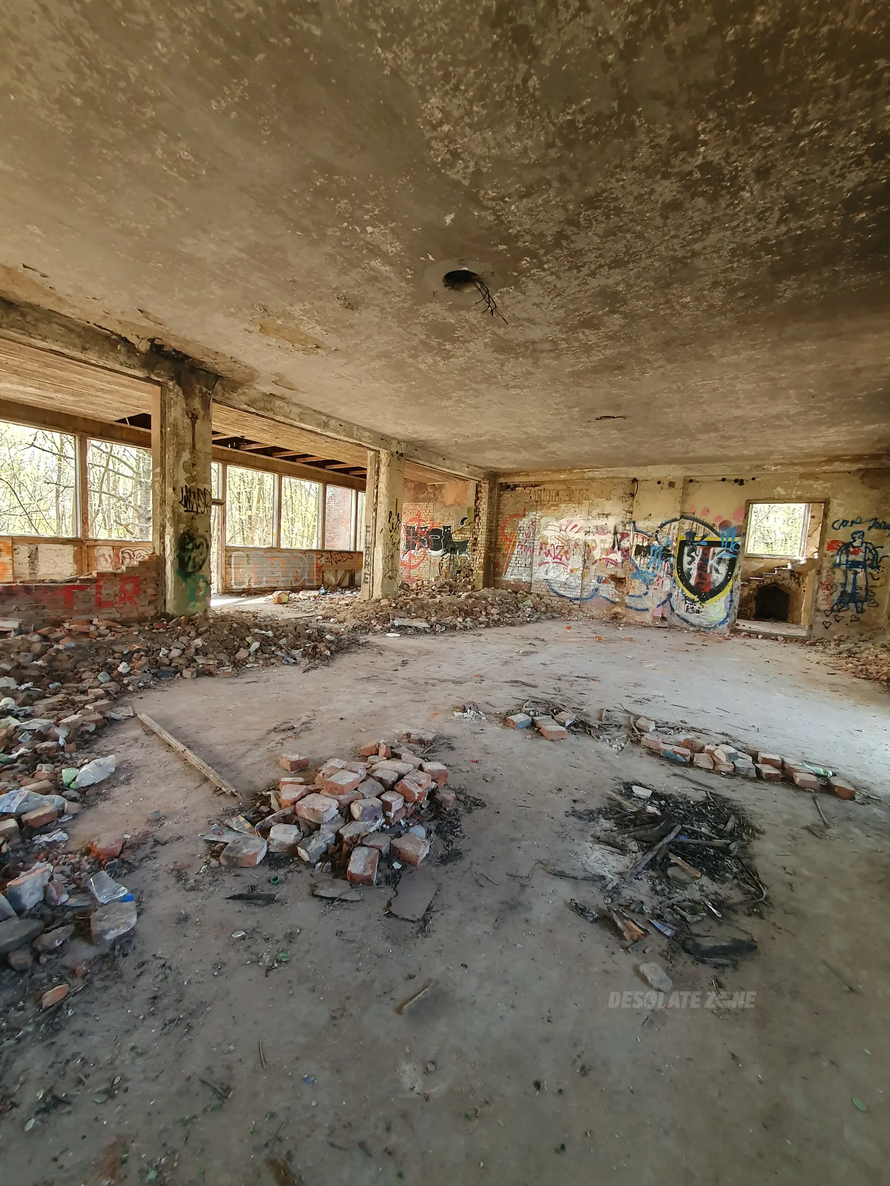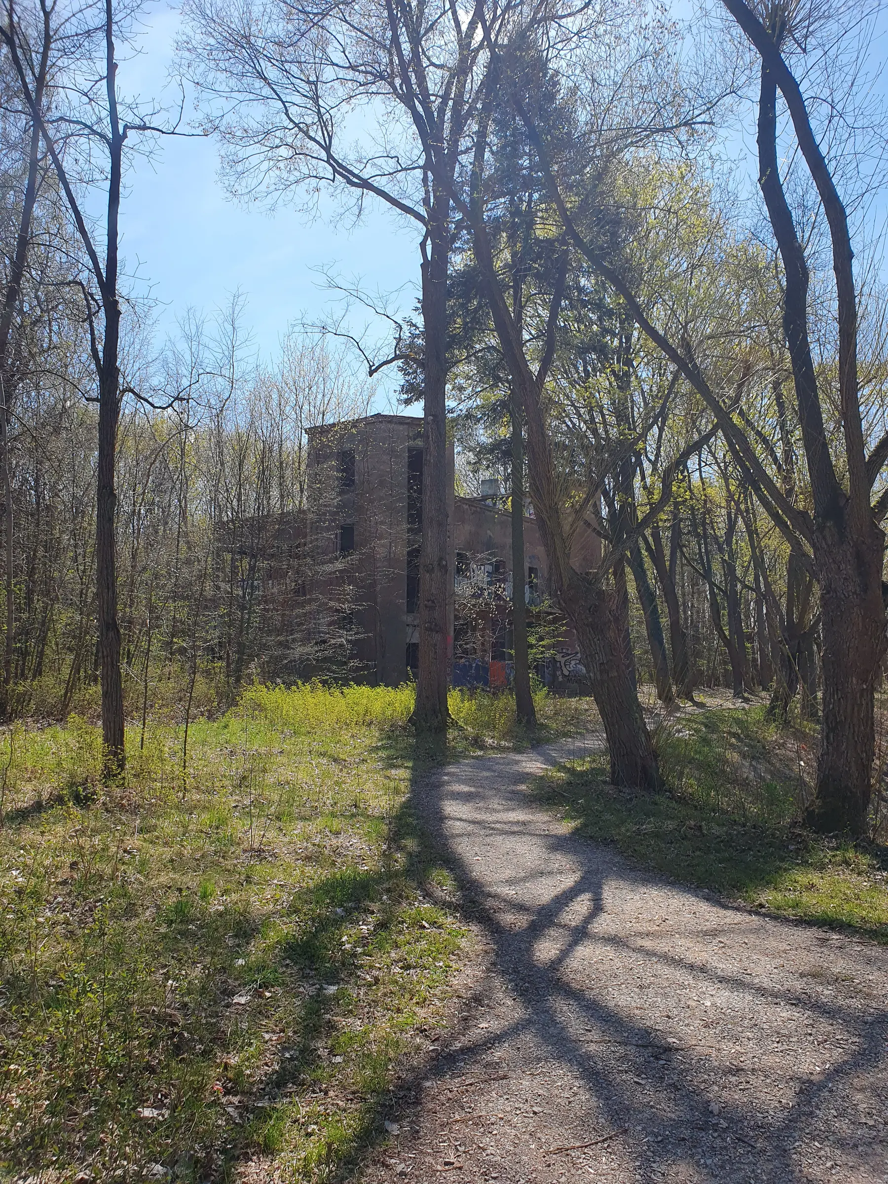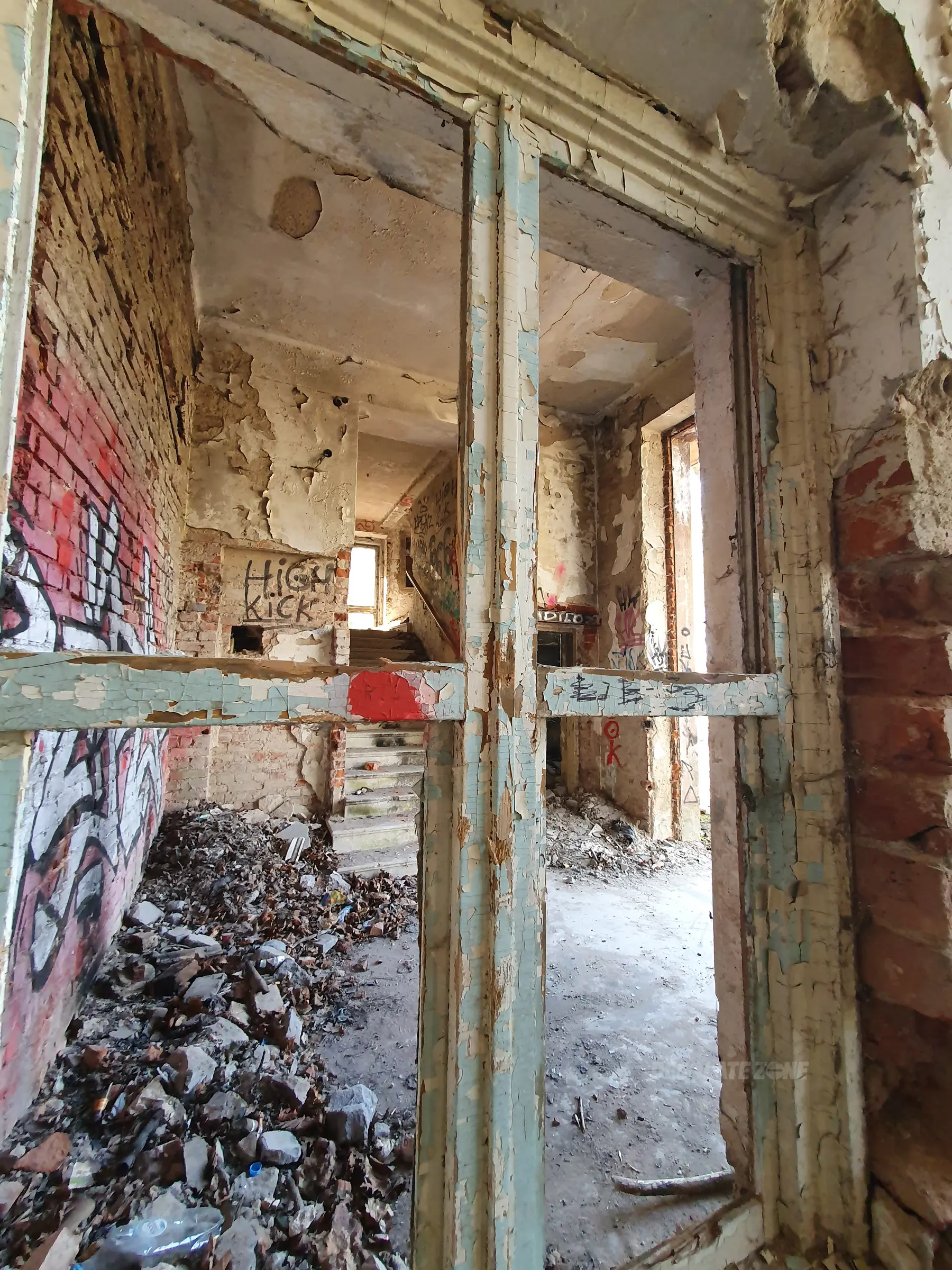 Kilka mniejszych budynków i jeden duży. Nic ciekawego poniszczone piętra zamurowane okna chociaż drzwi robią wrażenie. Można wejść na dach ale widoków nie ma. Teren bardzo duży i trochę chodzenia jest. Z daleka nie radzę. Załączam kilka fotek.
