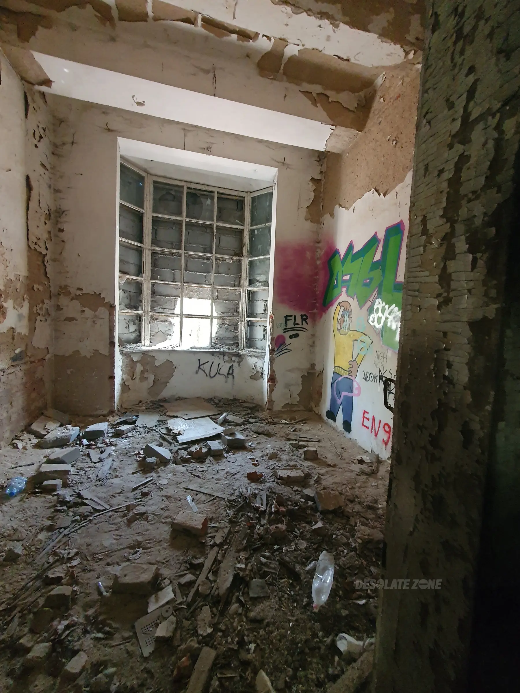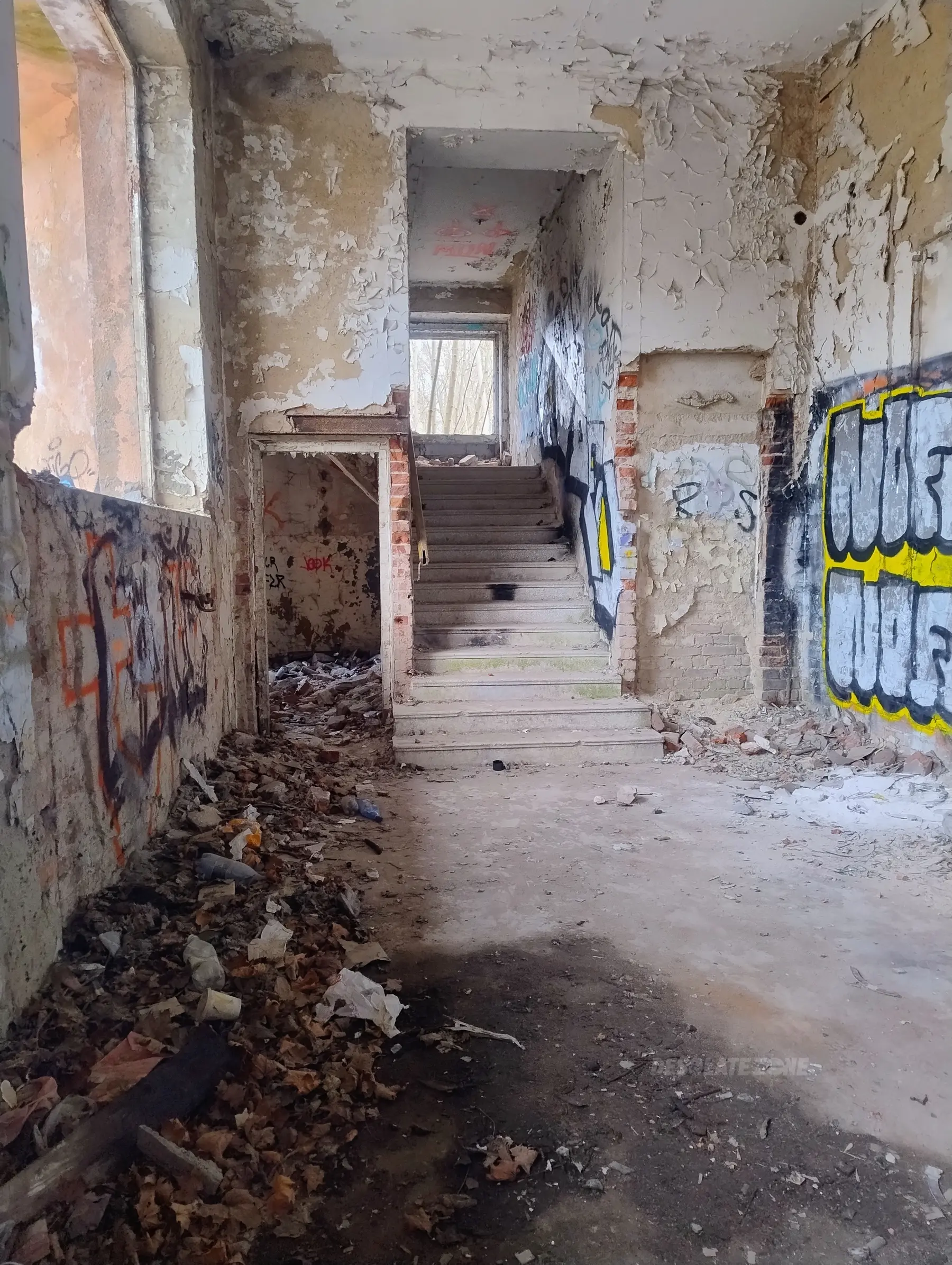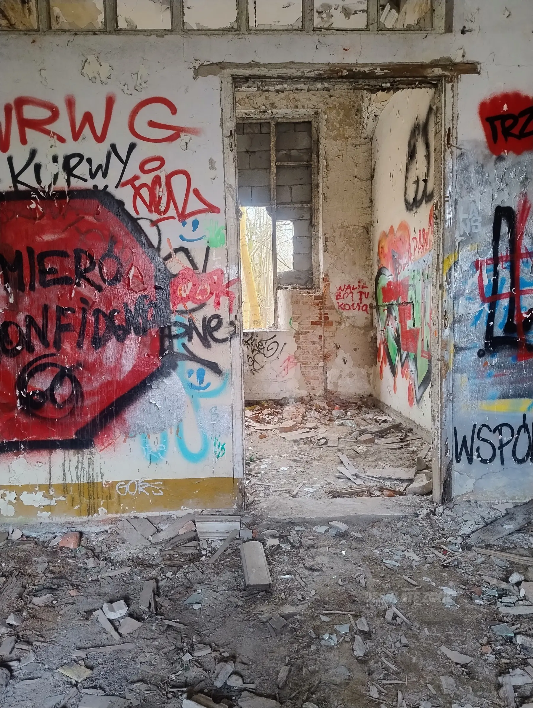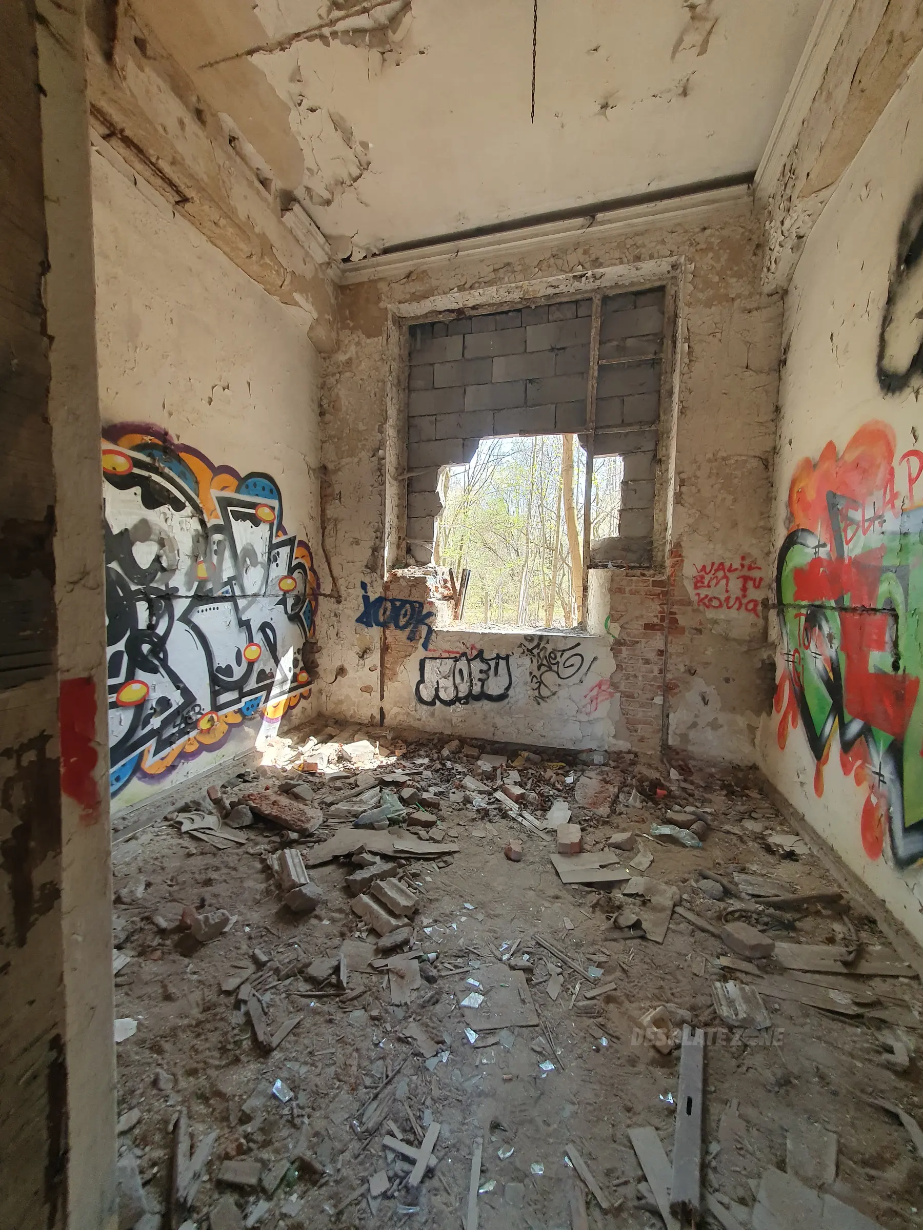 Kilka mniejszych budynków i jeden duży. Nic ciekawego poniszczone piętra zamurowane okna chociaż drzwi robią wrażenie. Można wejść na dach ale widoków nie ma. Teren bardzo duży i trochę chodzenia jest. Z daleka nie radzę. Załączam kilka fotek.