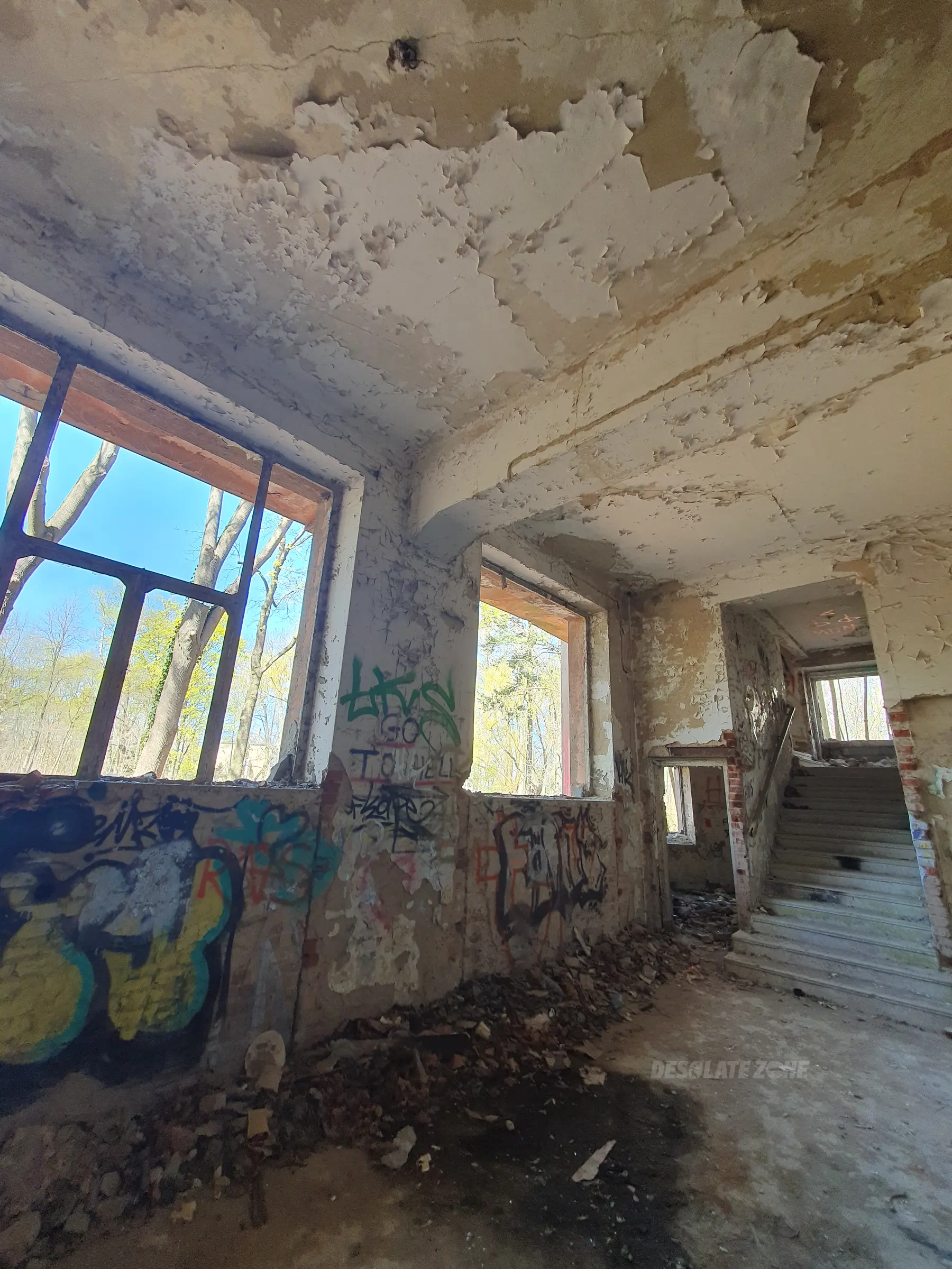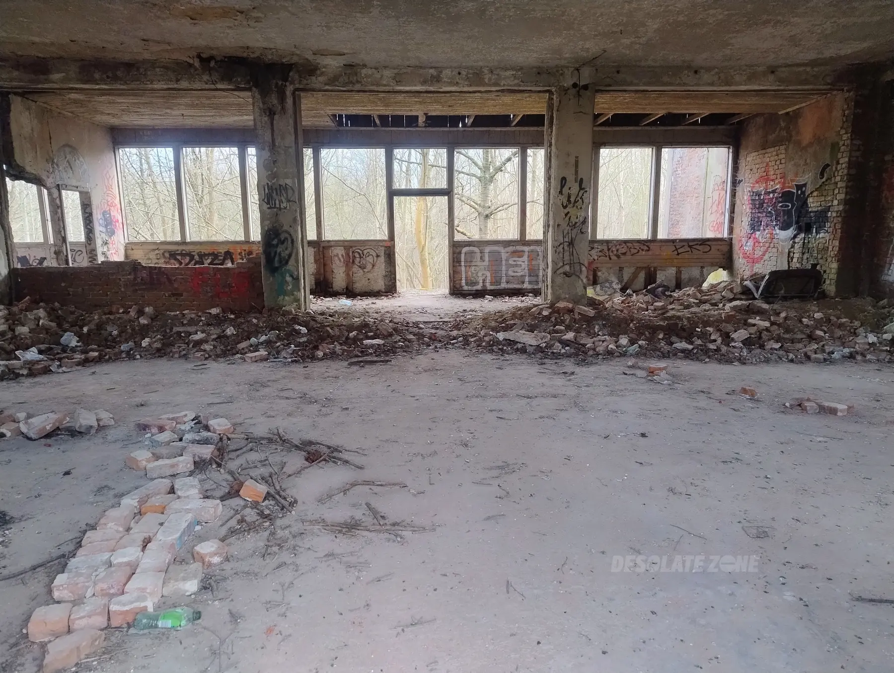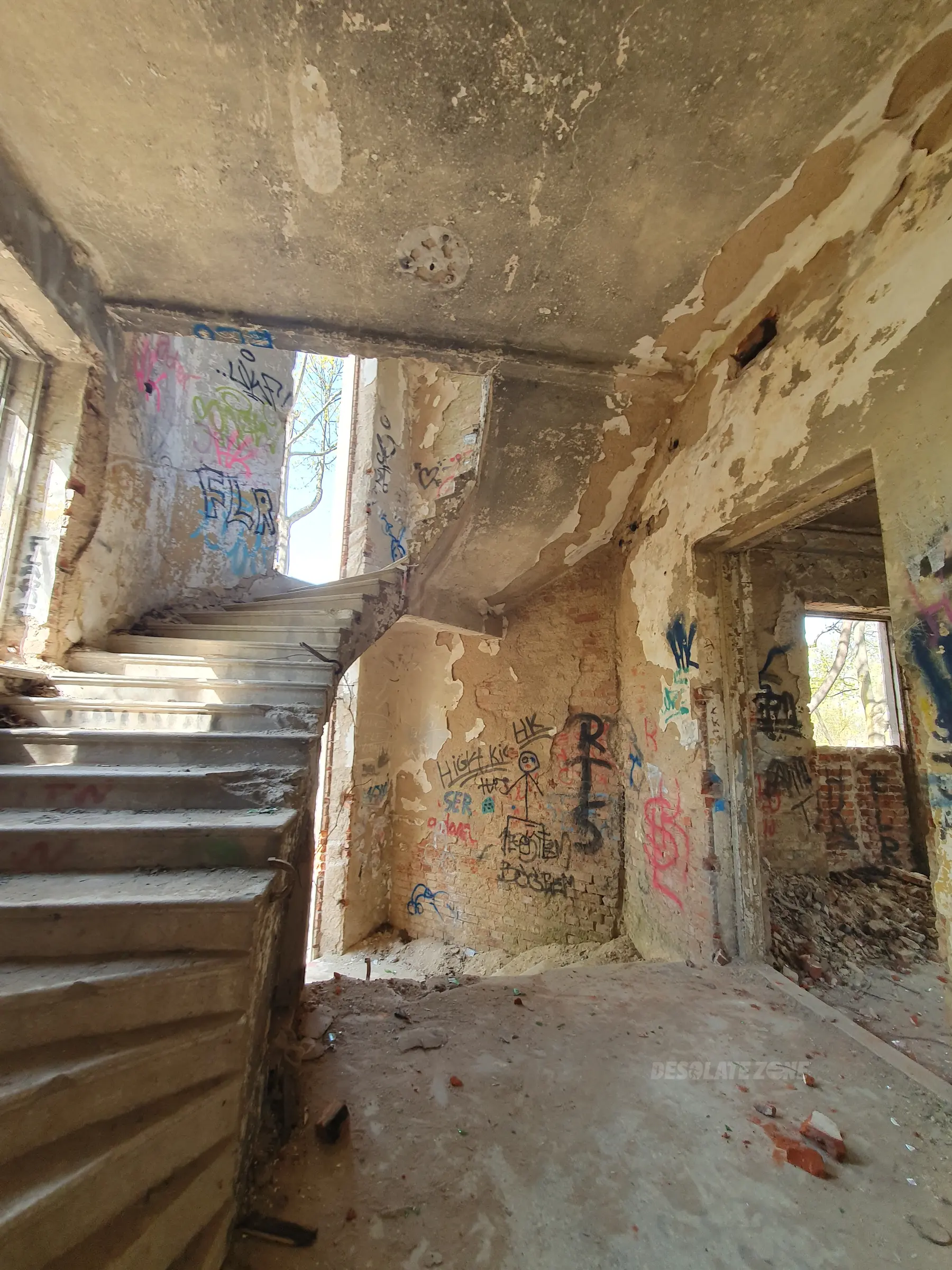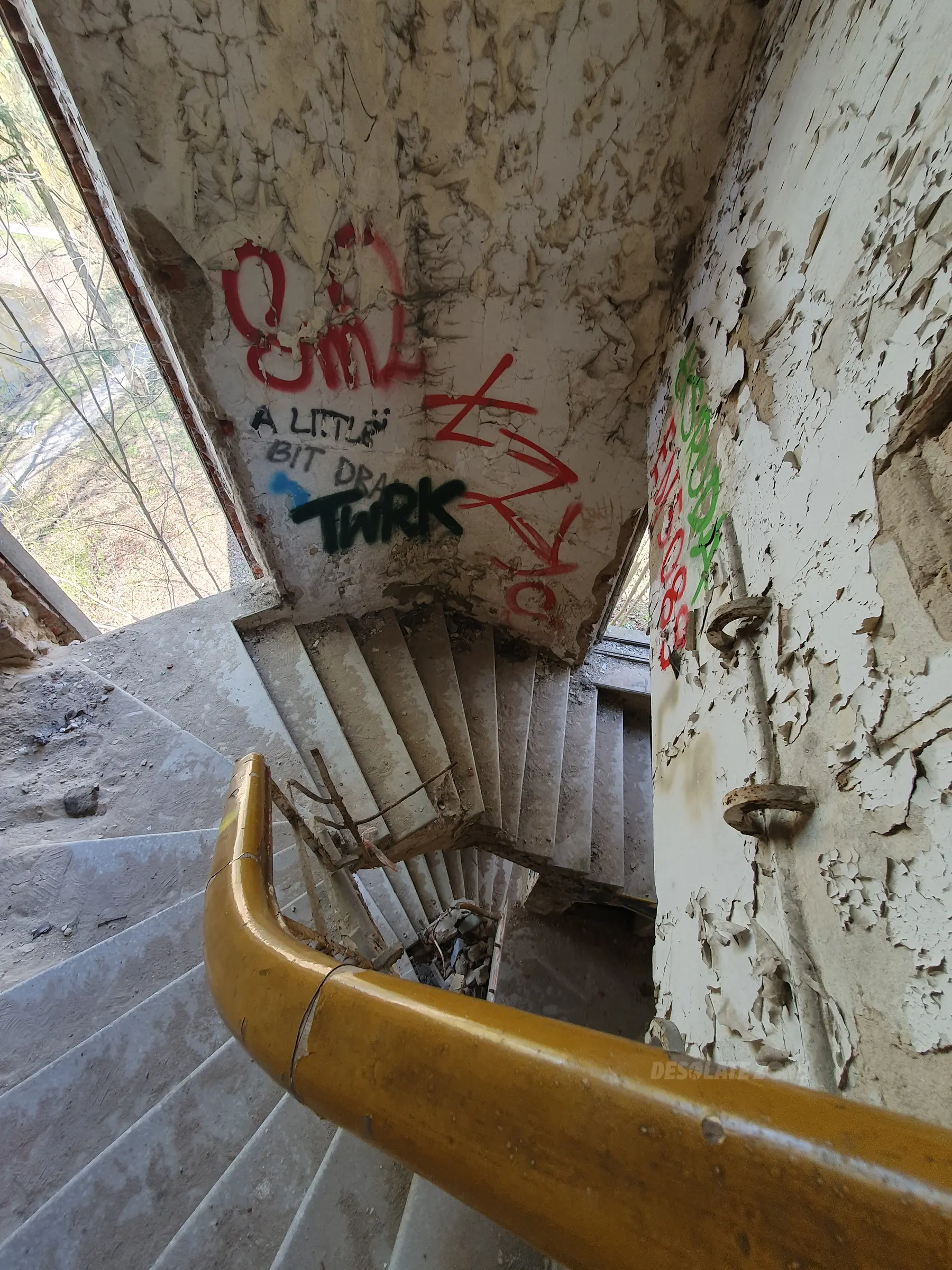 Kilka mniejszych budynków i jeden duży. Nic ciekawego poniszczone piętra zamurowane okna chociaż drzwi robią wrażenie. Można wejść na dach ale widoków nie ma. Teren bardzo duży i trochę chodzenia jest. Z daleka nie radzę. Załączam kilka fotek.