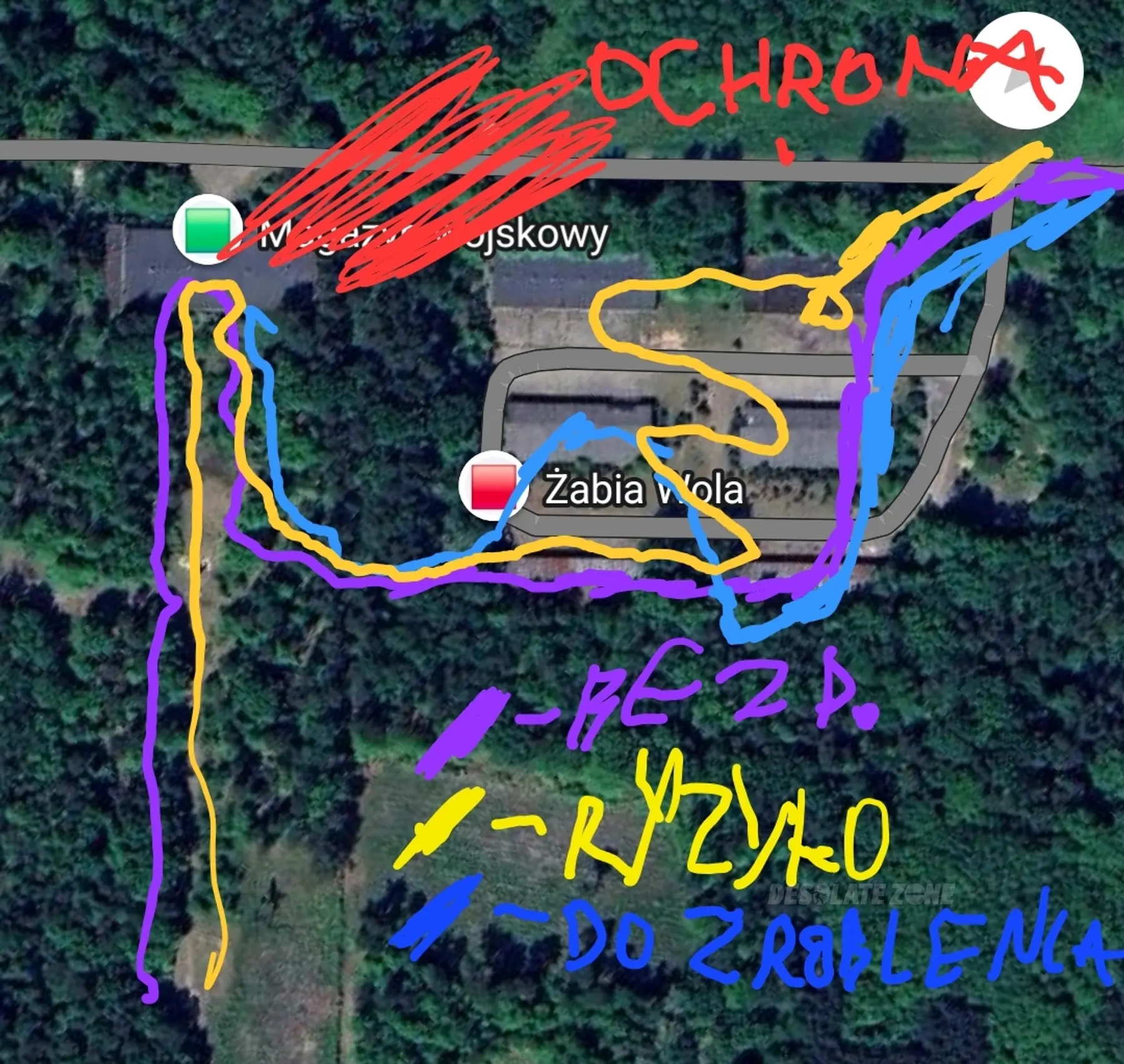 Magazyn główny najbardziej na zachód jest otwarty. Jest też wejście na jego dach po stabilnej, zabezpieczonej drabince. Cały teren jest teoretycznie chroniony przez wojsko, ale jedyne co można zauważyć do dwóch panów w stróżówce obok tego magazynu i psa, który wbrew pisanym komentarzom, nie jest groźny, ale potrafi przyciągnąć ochroniarzy. Płot jest wykonany z kolczatki, ale mocno uszkodzony, przez co w wielu miejscach są dziury. Reszta budynków to małe wiaty albo mniejsze budynki techniczne. Kamera zauważona tylko na stróżówce, a jeśli chodzi o czujniki ruchu to są w budynkach, ale zepsute lub poprostu nieaktywne. Miejsce bardzo dobrze zachowane i bez grafitti. Każdy kto ma zamiar to odwiedzić, niech zostawi to w takim samym stanie jak zastał.
