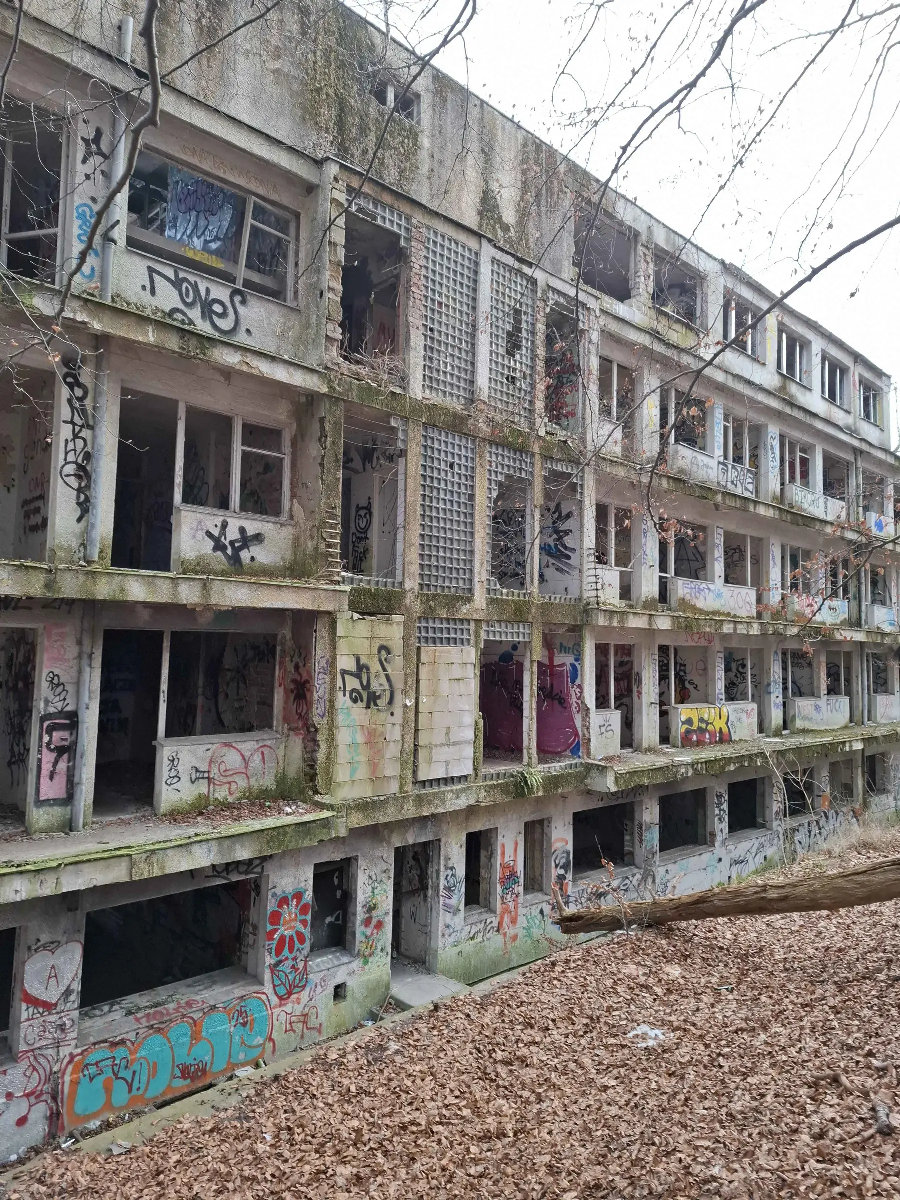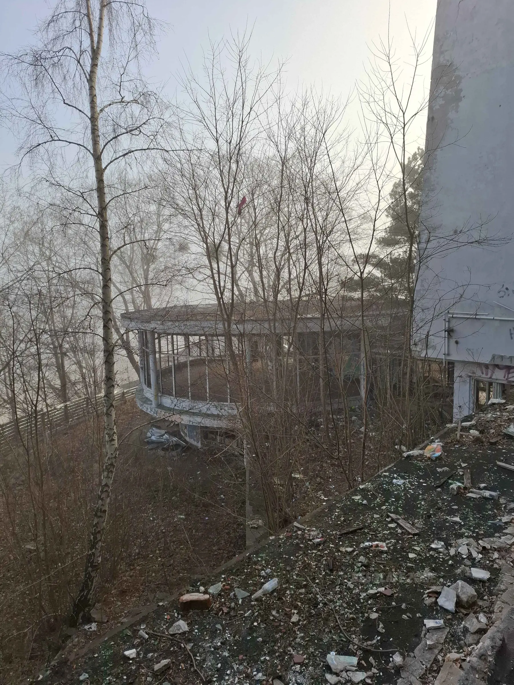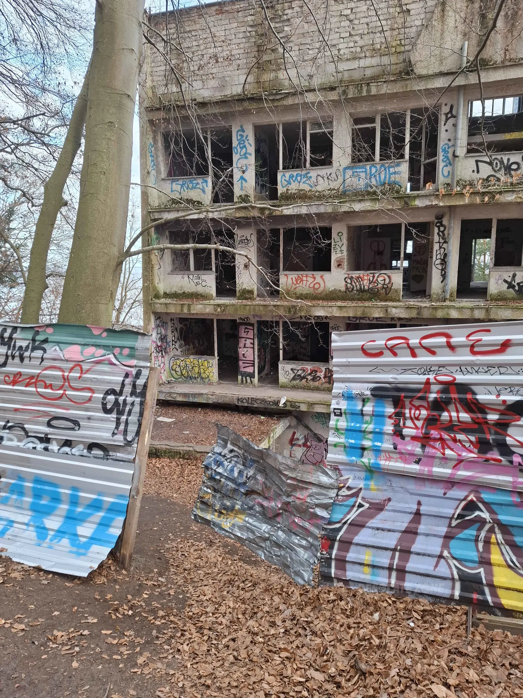 O dziwo wejście również jest utrudnione (ogrodzone blachami budowlanymi), ale z tyłu ośrodka jest spora dziura w ogrodzeniu, przez którą każdy może sobie wejść bez problemu.