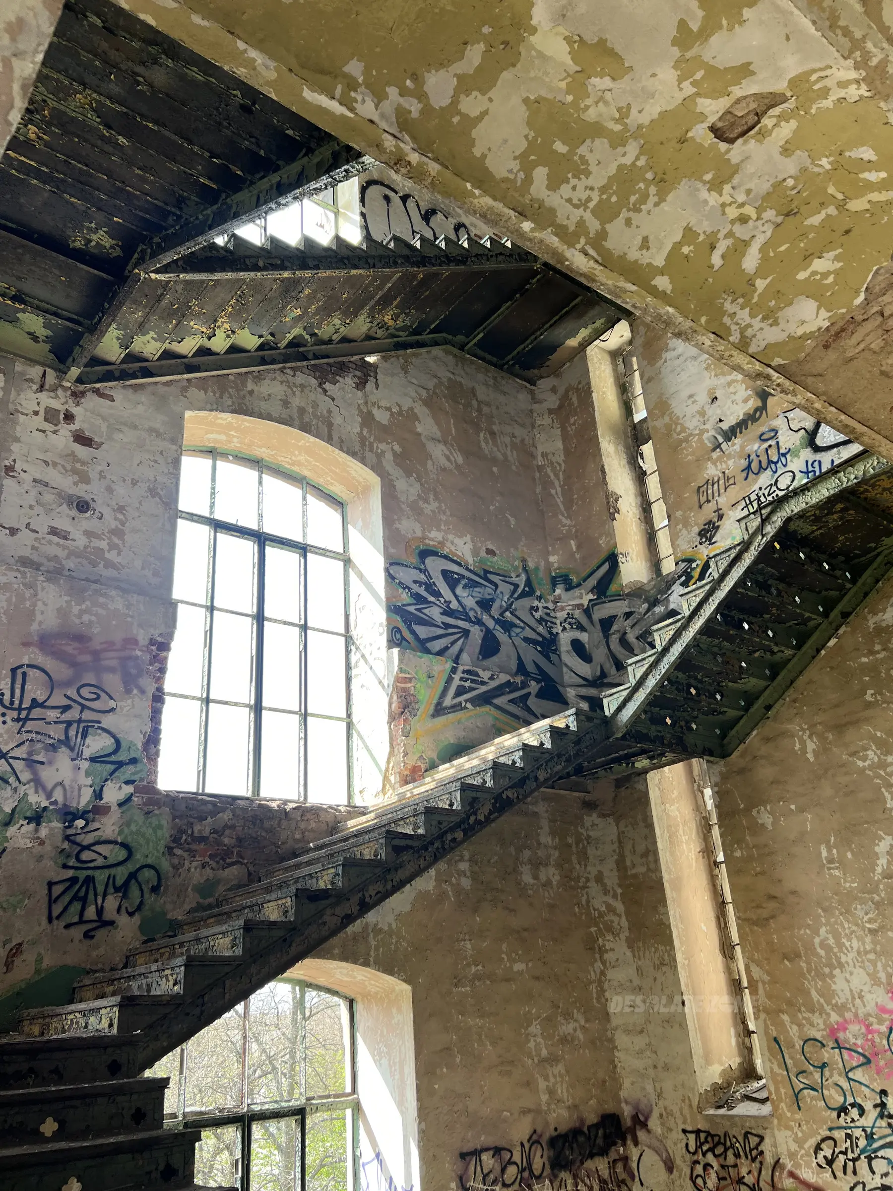 Na głównych zielonych metalowych schodach polecam uważać ponieważ brakuje jednego schodka na poziomie 1 piętra. Drewniane schody na dach jakoś się trzymają i nie wydają dzwięków jakby miały się zarwać. Druga klatka schodowa ma bardzo wyrobione betonowe schody, łatwo jest się potknąć na nich i przewrócić. Z dachu pięknę widoczki na całą Łódź. W zimę nikogo tam nie ma, lecz w lato pewnie jest więcej osób.