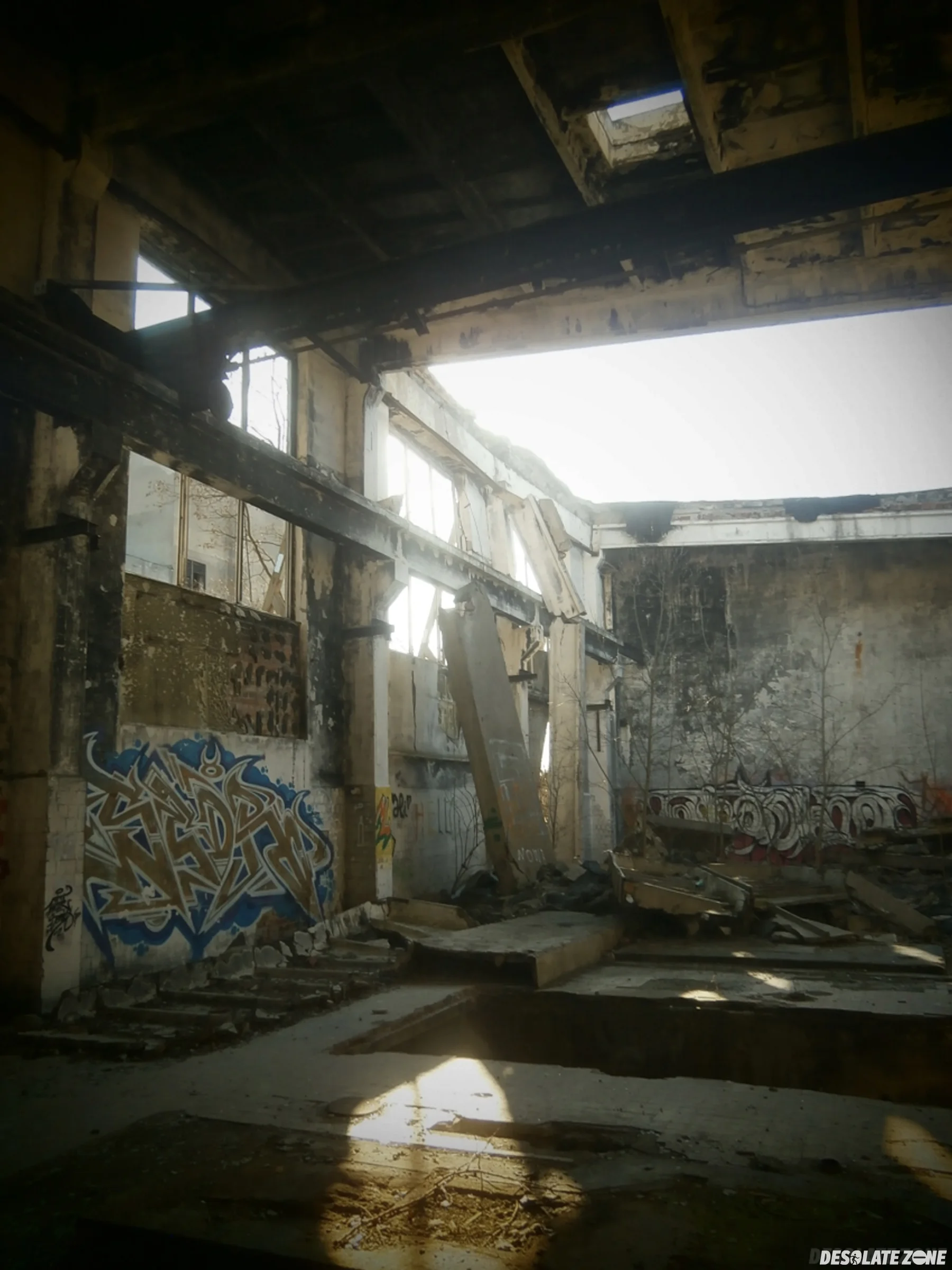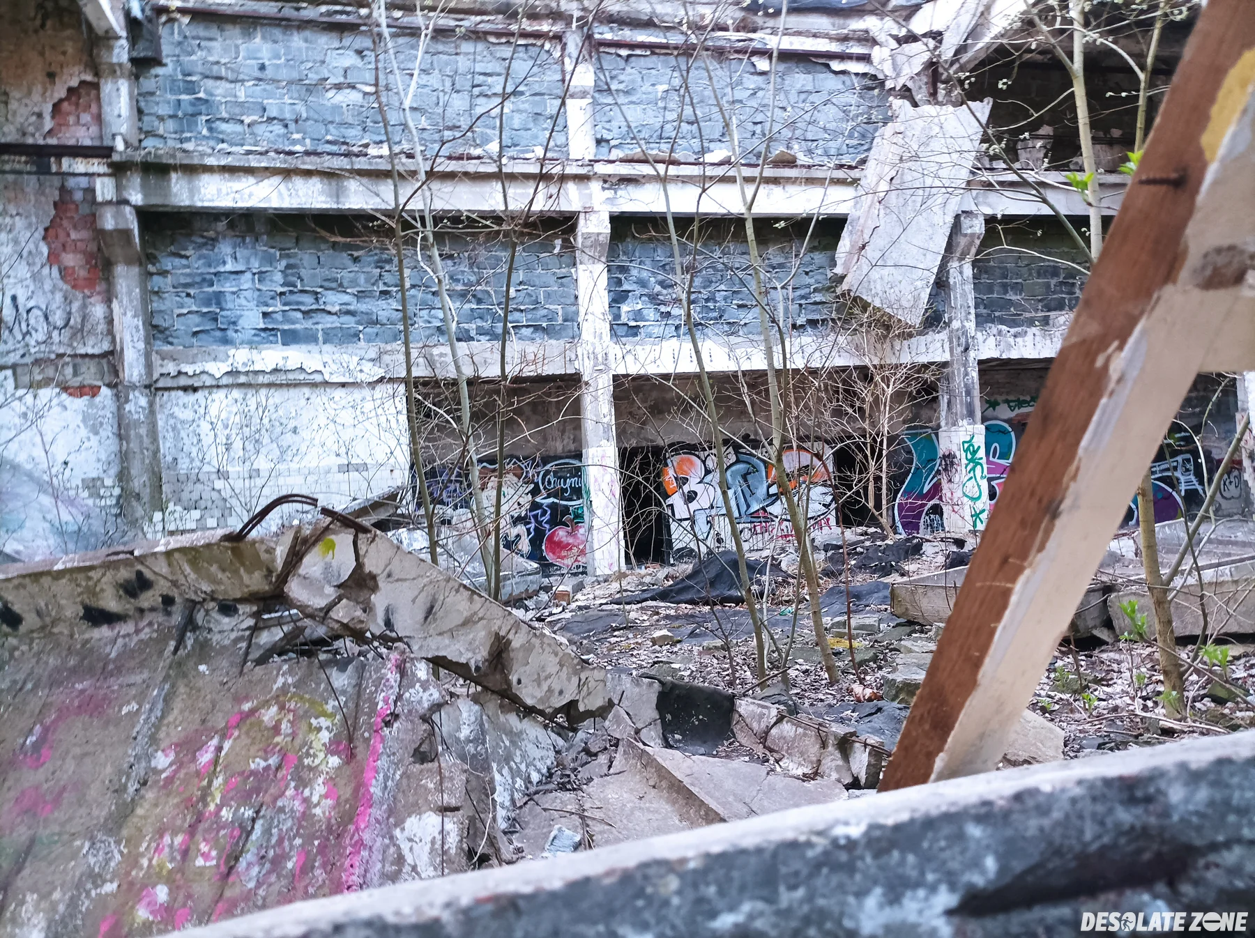 Kiedyś była to wykańczalnia dzianin. Miejsce najłatwiej dostępne z przodu, przez taką wielką dziurę w ścianie(2 pionowe betonowe słupy i po środku jeden poziomy słup z betonu, tam gdzie jest pinezka). Przy wchodzeniu zalecam obejrzeć czy nikt nie patrzy, ponieważ obok jest strzelnica i jeszcze jakieś tam zakłady. Przed wejściem są kamery i alarm, lecz alarm są wyłączony, nie wiadomo czy kamery są wyłączone, lecz pewnie też. W budynku jest bezpiecznie, czasami, ale to naprawdę czasami może jakiś kamień upaść. Zejście do piwnicy według mnie jest ok. Wejście na pierwsze piętro jest też ok, tylko trzeba uważać na schodach aby się nie spierdzielić z nich, najlepiej poprostu iść przy ścianie. W budynku można zobaczyć jakieś pozostałości po elektronice, przyciski pożarowe, dużo betonu na podłodze, fajne graffiti, i pozostałości po jakieś maszynie na suficie. Po wejściu trzeba uważać na duża dziurę w holu. (dach przy wejściu jest cały zarwany, lecz nie ma co się bać. reszta dachu jest stabilna). Budynek ma trzy kondygnacje: piwnicę, parter i pierwsze piętro. Wejście na dach NIE jest możliwe.
