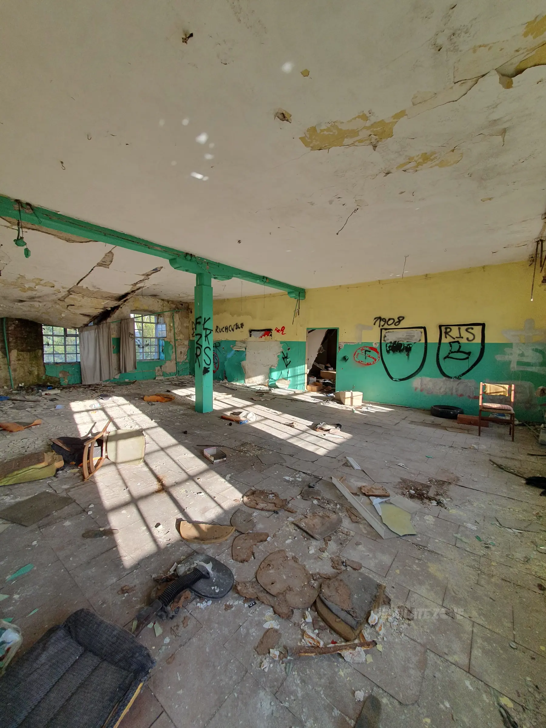 strasznie zaśmiecone. widać że ktoś nocuje w budce ochroniarza, smród niesamowity. w dalszym budynku nie da rady zwiedzić piętra bo całe obsrane. dostęp łatwy przez brame