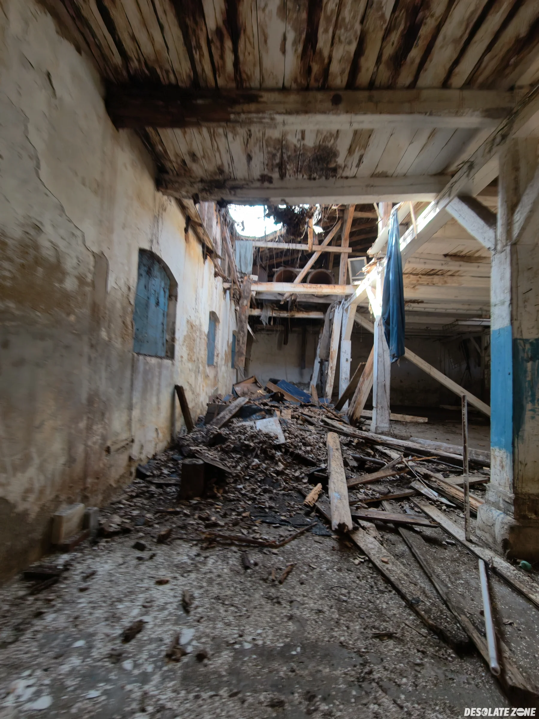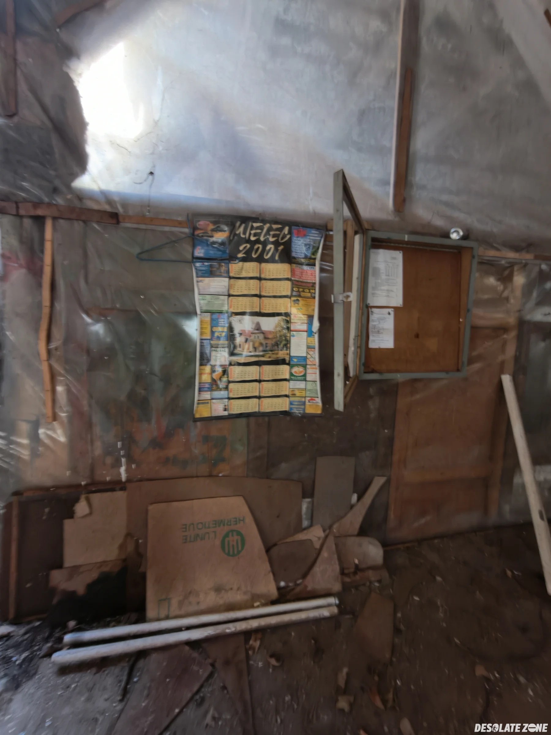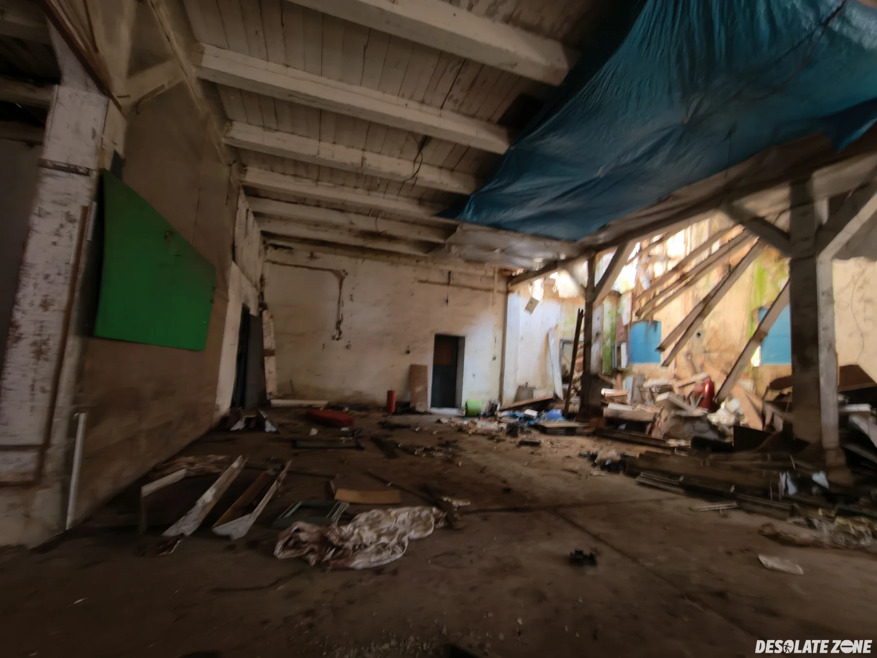 Łódzki okręgowy związek żeglarski. Budynek jest przy barze wodnik i wejście jest od tylu drzwiami. Przed budynkiem są dwie łódki. W środku jest trochę grzyba ale tak to jest git. Oprócz zawalonej części dachu są też różne rzeczy na podłodze.