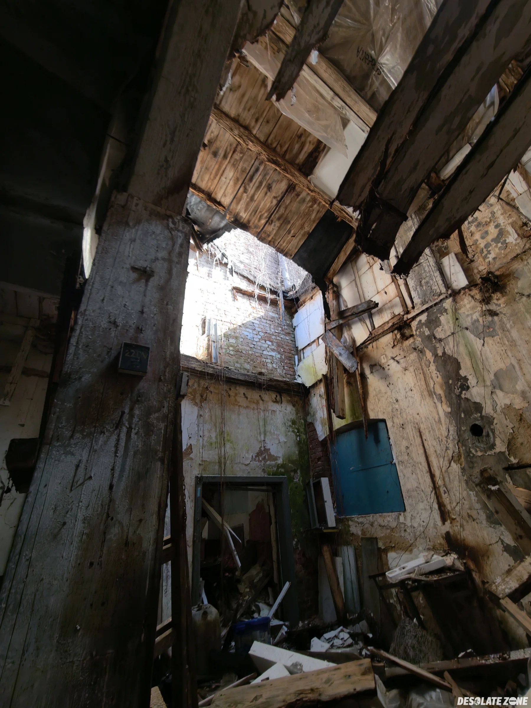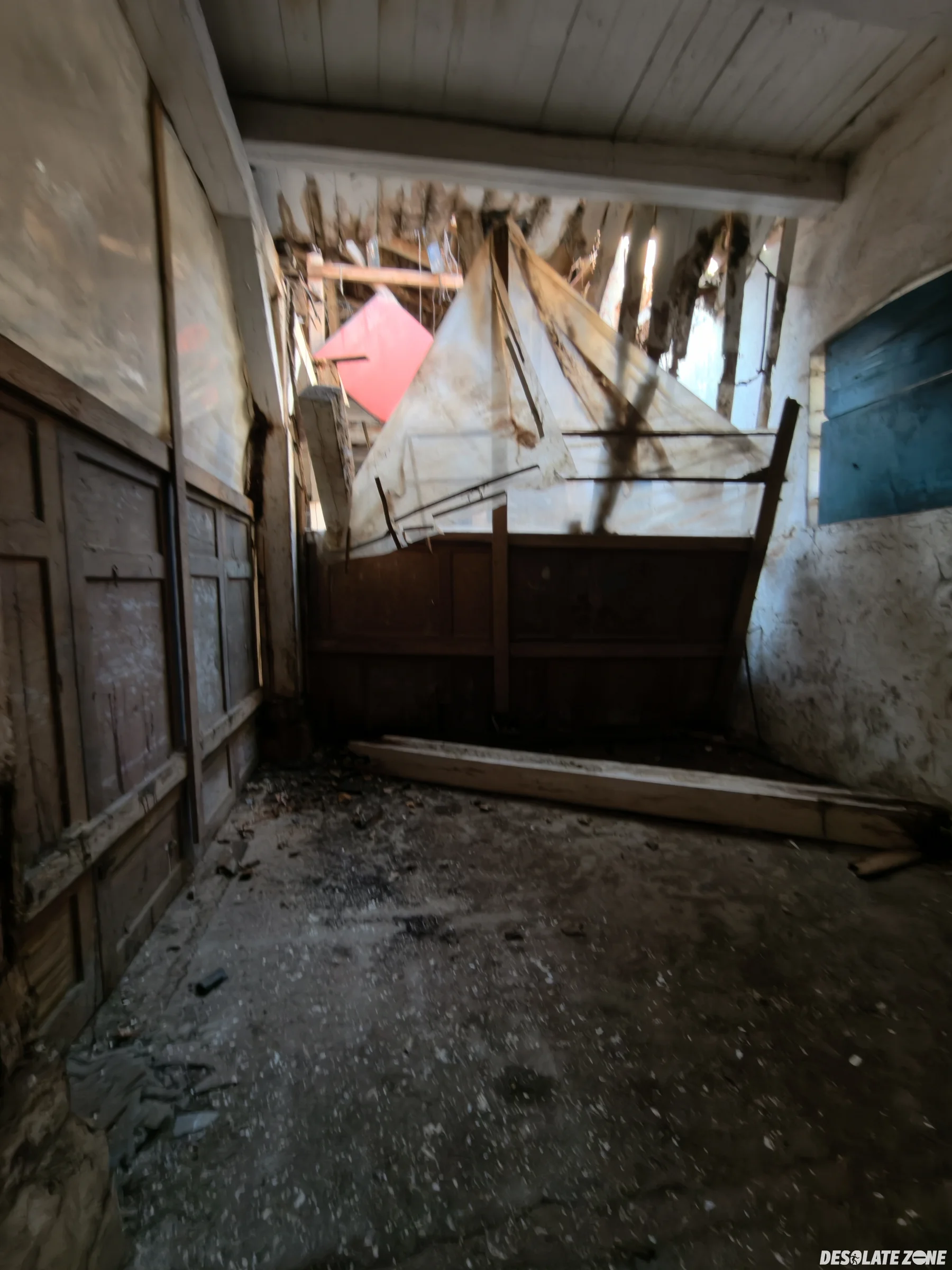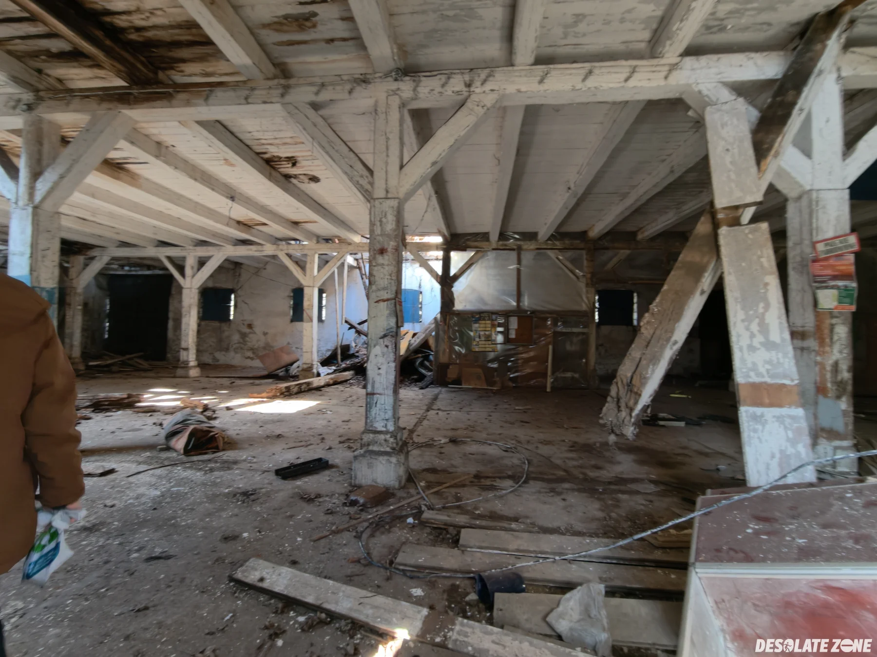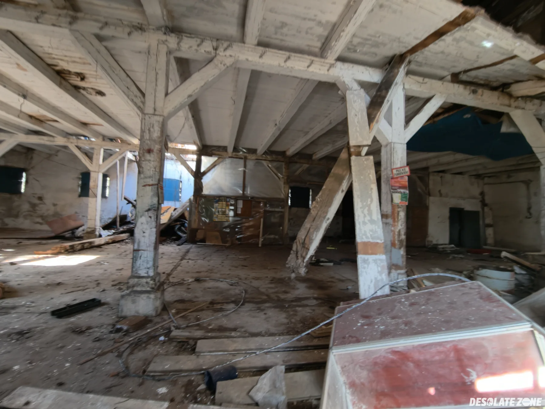 Łódzki okręgowy związek żeglarski. Budynek jest przy barze wodnik i wejście jest od tylu drzwiami. Przed budynkiem są dwie łódki. W środku jest trochę grzyba ale tak to jest git. Oprócz zawalonej części dachu są też różne rzeczy na podłodze.