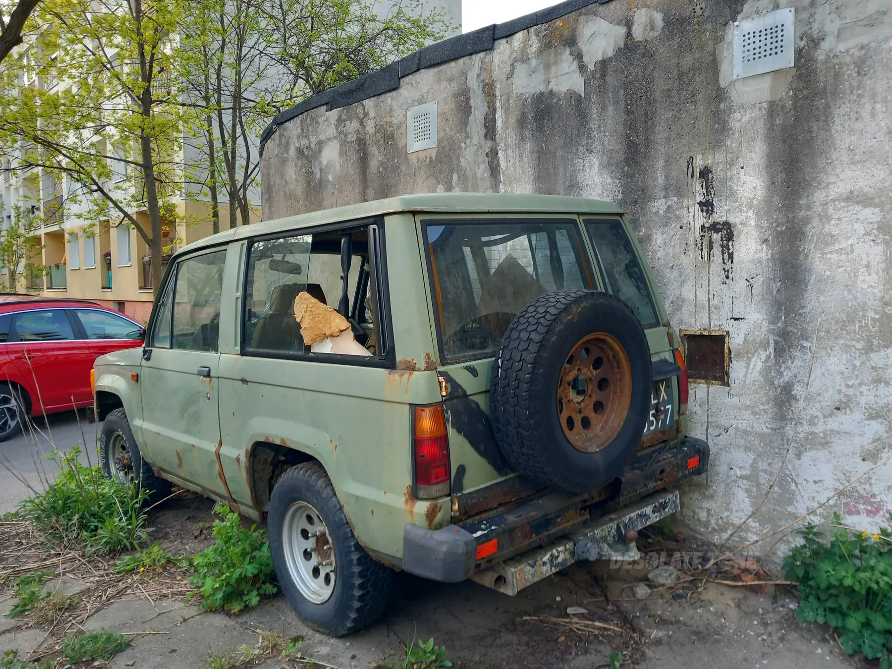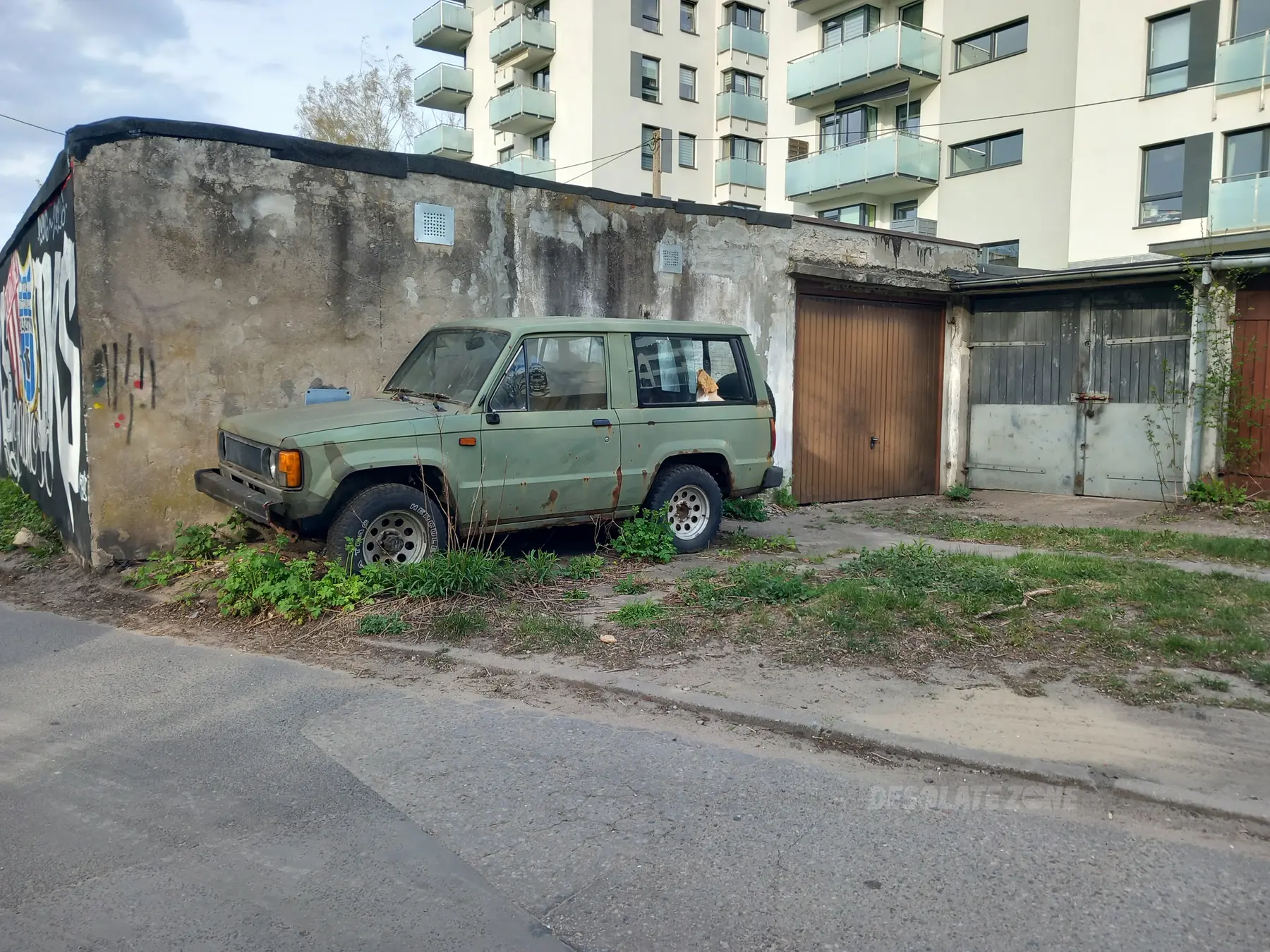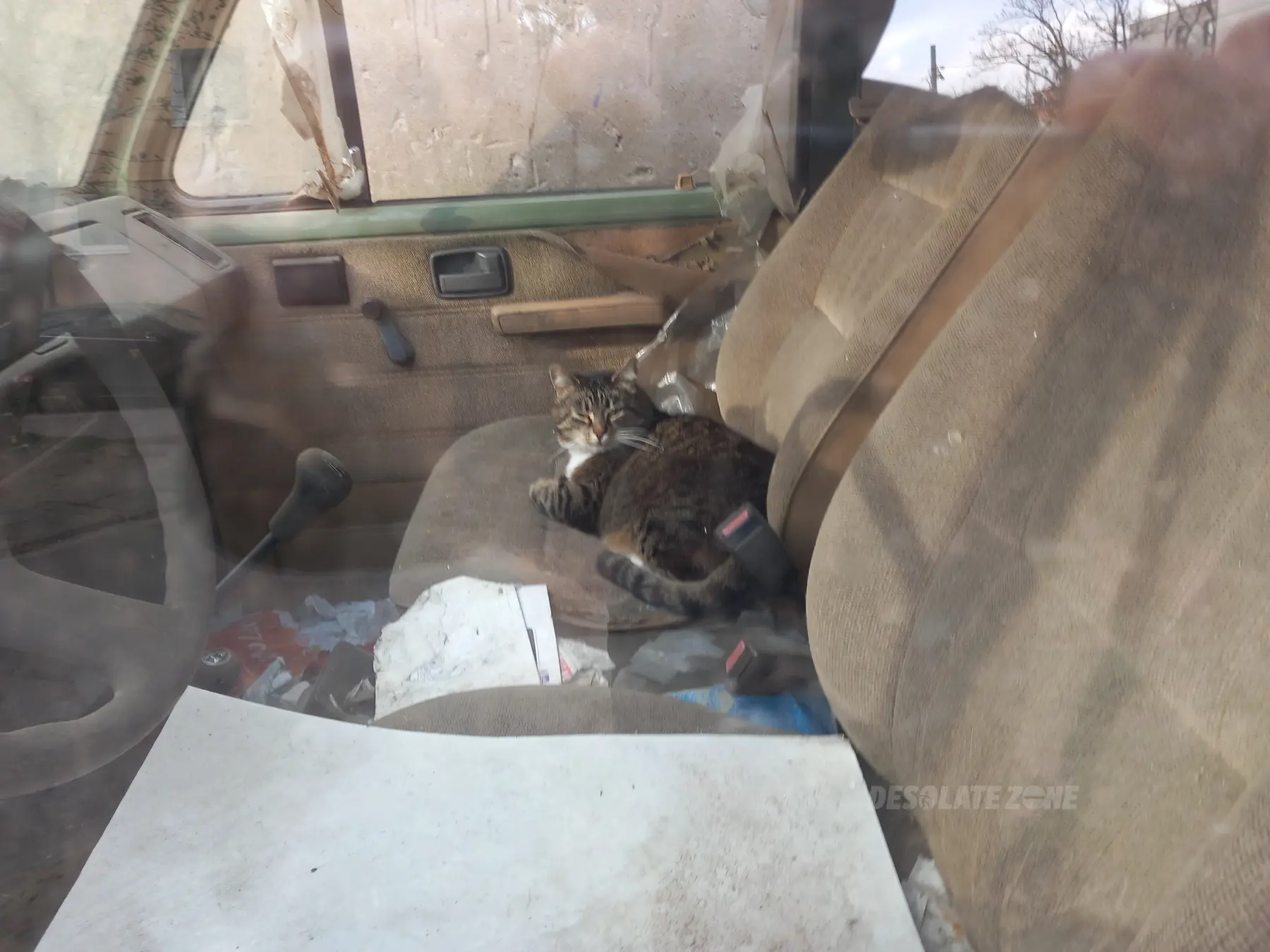 Stary samochód stoi od długiego czasu, czasem przy miejscu pasażera siedzi sobie kotek